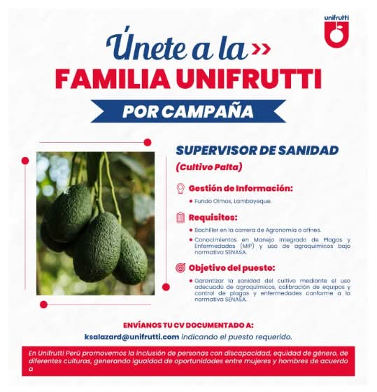 Supervisor de sanidad (cultivo de palta)por Empleabilidad Tiempo completo Publicado hace 3 meses Características Categoría de PuestoProducción Agropecuaria Aplicar para este trabajo Name*Email*Phone*Se requiere un número de teléfono válido. Cover Letter*Adjuntar currículum* Enviar Close